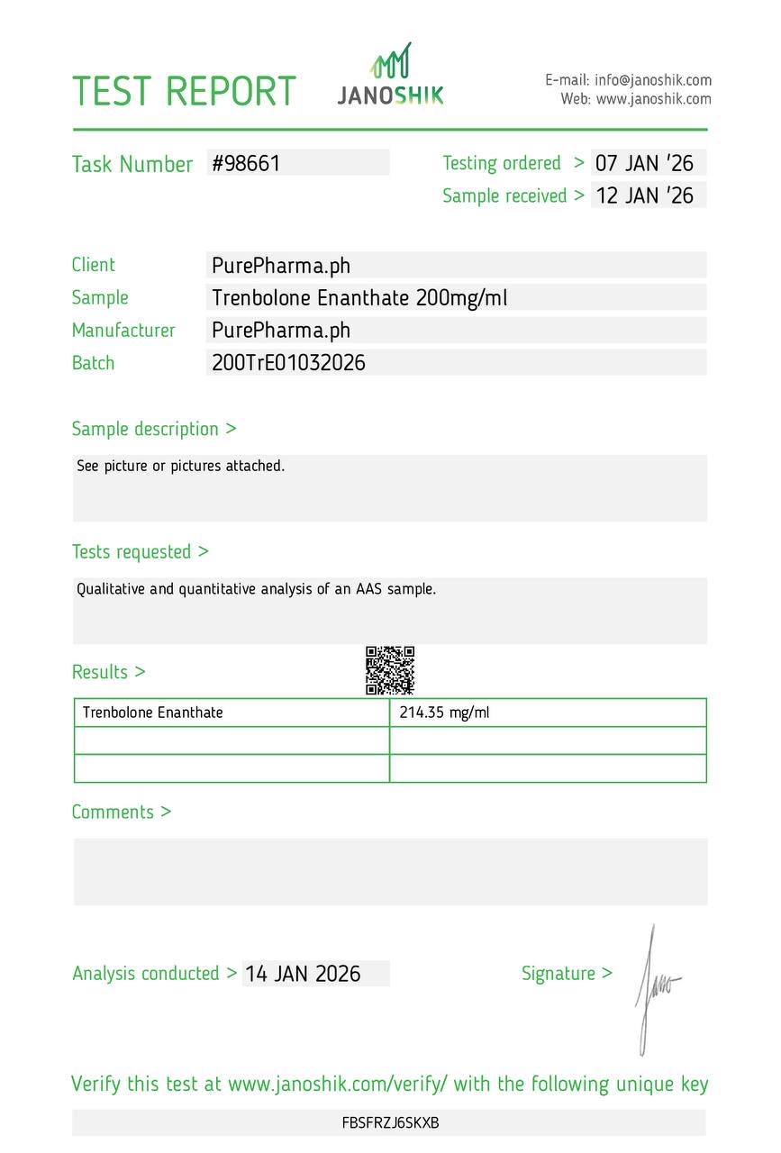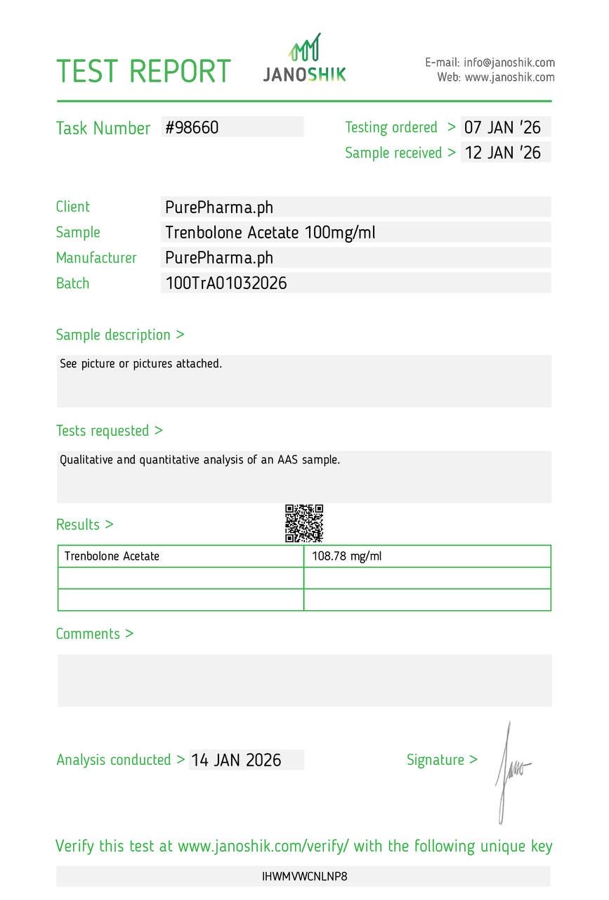 Test Results Trenbolone Acetate Trenbolone Enanthate BPC-157+TB-500 10mg/10mg Somatropin 10mg (HGH) Nandrolone Decanonate Somatropin (HGH) 36iu